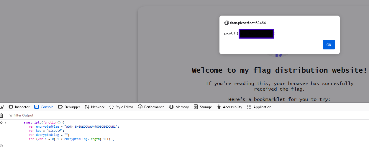 double clicking into the code box will automatically copy all of the code so from there we can now decide where we can paste this code. Instead of trying to open some ide or an online javascript runner we can just use the built-in one most browsers have. If you open the inspector you will find a tab named console from there you can paste and run the given code which will open an alert box with our flag!